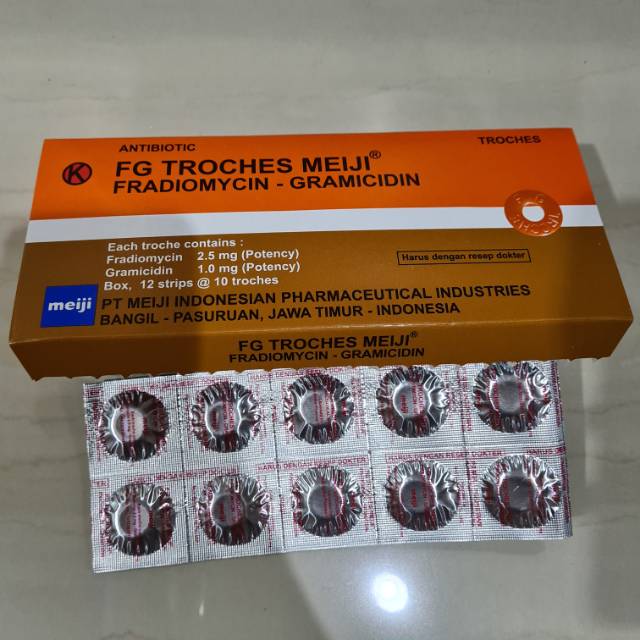 Penggunaan obat, salah satunya adalah penggunaan antibiotik. Ciprofloxacin 5,7%, fradiomycin sulfate and gramicidin 5,7%, tetracycline 4,6%, . Toras 8mg 10 tablet/ methyl prednisolone/ obat radang/ fg troches. Fg troches meiji adalah obat tablet hisap yang mengandung dua antibiotik; Indikasi umuminformasi obat ini hanya untuk kalangan medis. Untuk fg troches memang obat yang mengandung antibiotik,. Toras 8mg 10 tablet/ methyl prednisolone/ obat radang/ fg troches. Harga tertera adalah harga per strip (@10 tablet). Fg troches meiji adalah obat tablet hisap yang mengandung dua antibiotik, fradiomycin dan gramicidin. Fradiomycin dan gramicidin adalah dua jenis antibiotik yang mempunyai efek membunuh bakteri (bakterisidal) dengan spektrum luas. Obat ini digunakan untuk membunuh bakteri penyebab . Kedua bahan dalam fg troches . Obat kesehatan • mengandung fradiomycin dan gramicidin yang merupakan antibiotik yang digunakan untuk membantu membunuh bakteri